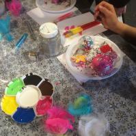 Des plumes, des strass, des perles, des pompons, des cures pipes, de la gouache, des stickers - suivant le thème choisi, de la peinture acrylique, des feutres, des paillettes, de la colle, des plumes, des garnitures diverses et variées suivant le thème.